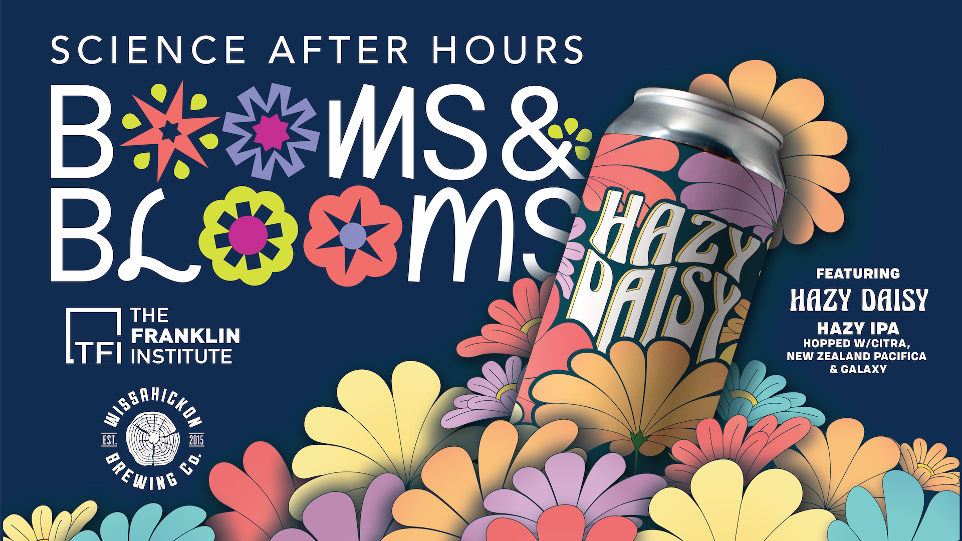 My first thought was to incorporate Benjamin Franklin himself, sitting in a field of daisies. With the historical nod, the design includes a levity that matches the fun atmosphere of the after-hours event.